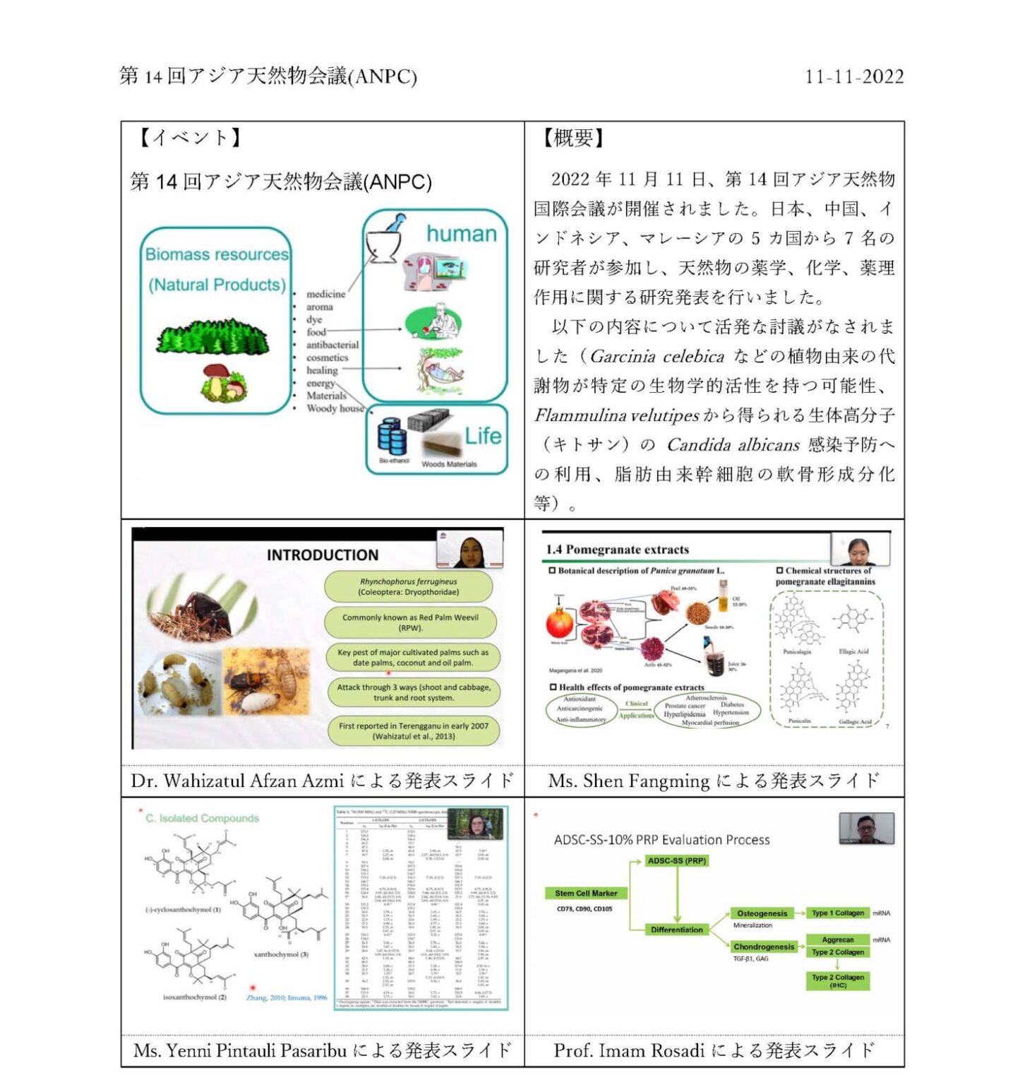 The 14th International Asian Natural Products Conference was held on November 11th, 2022. Seven researchers from five countries, consisting of Japan, China, Indonesia, and Malaysia participated to present their research about the pharmaceutical science, chemistry, and pharmacological effects of natural products.