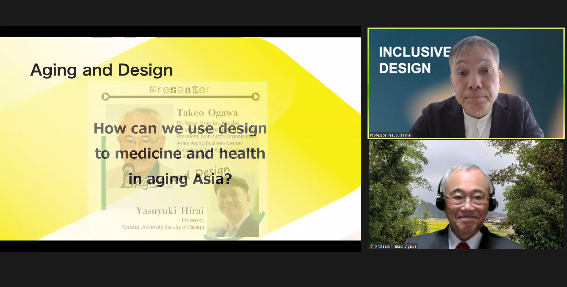 For this century, Asia has become the center of population aging as it is deemed to face greater challenges posited by demographic shift. This session focuses on challenges associated with medicine, health, and welfare in a rapidly aging Asia. This session was planed to share the latest knowledge on these challenges, and to discuss how these challenges may be addressed, in some selected national contexts, with strategies that are informed by multidisciplinary perspectives including health sciences, public health, social policy, and design.In the event, keynote lectures were held by 4 experts in the field of health care, public health, policy, and design. The online health care for the elderly in Taiwan was very interesting, and there are many things that Japan should learn from them. The session ended on a high note with a lively discussion based on many opinions from the panelists and participants.