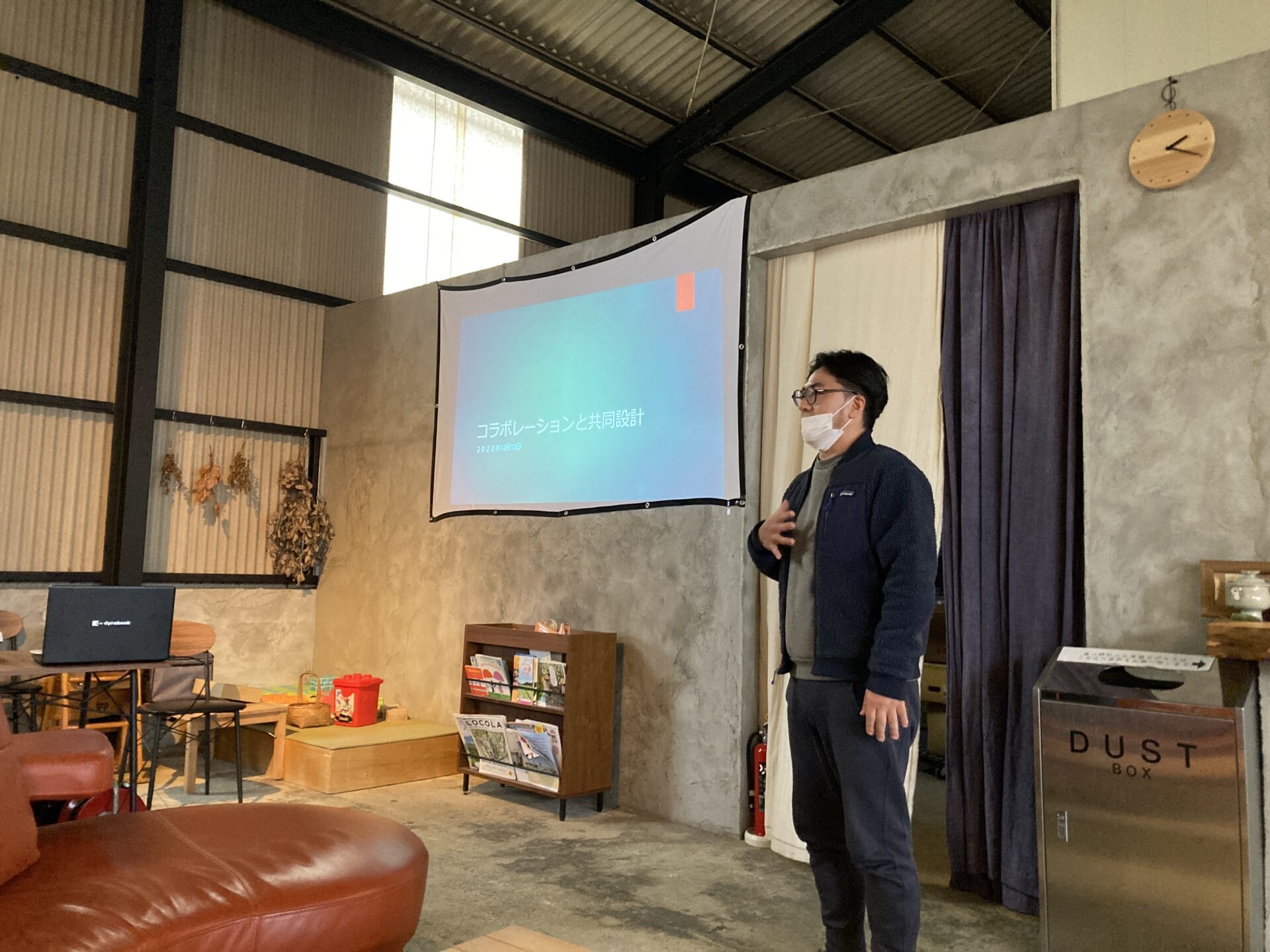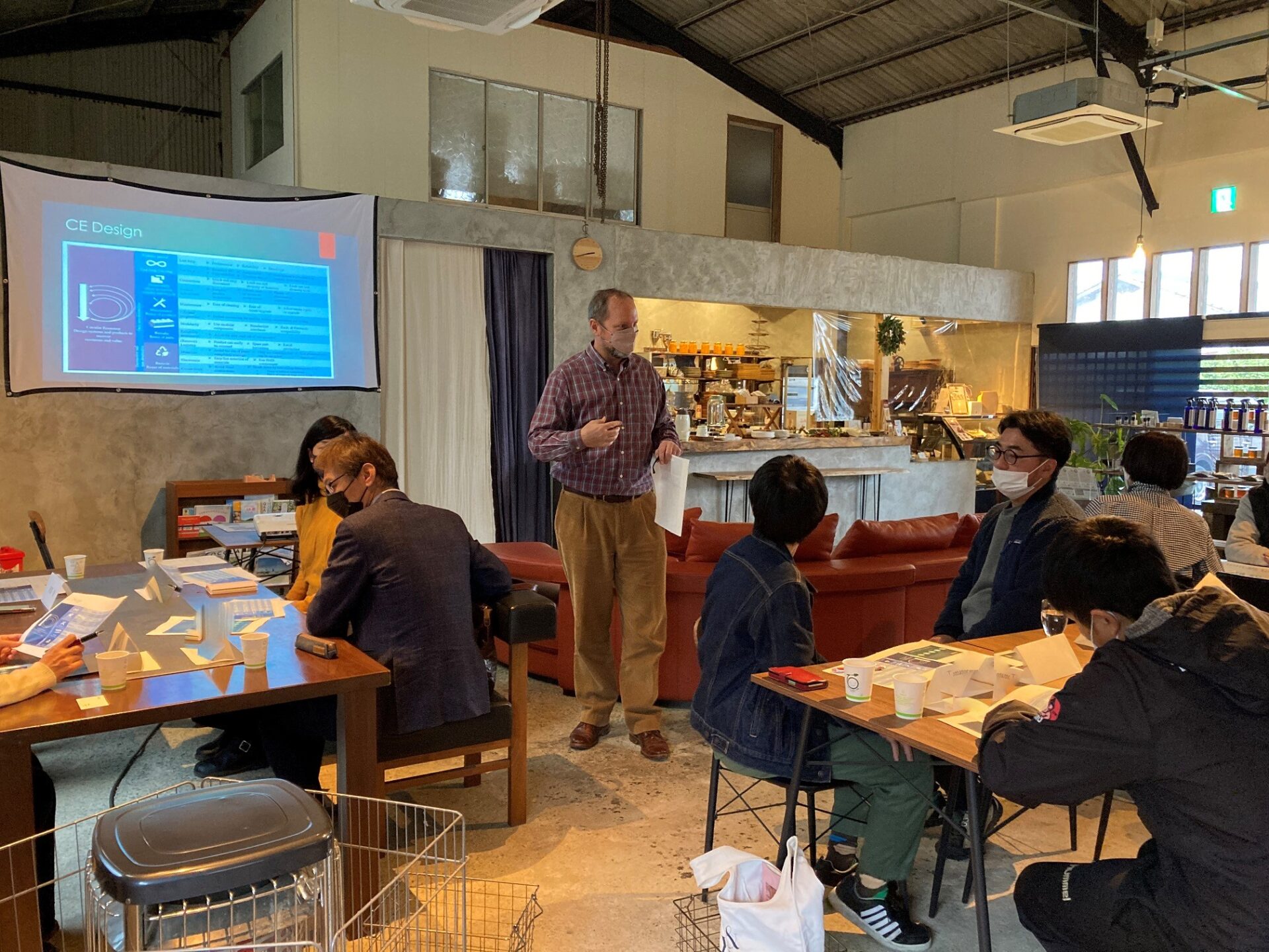 2022年12月13日(火)、糸島市二丈吉井にある、わかまつ農園の直売所&カフェ「お菓子と暮らしの物 りた」にてアジア・オセアニア研究教育機構のバレンタイン教授による「循環経済デザイン思考戦略 – 既存製品・サービスのデザイン」ワークショップが行われました。最初に、わかまつ農園の若松さんによるこれまでの取り組みに関するお話がありました。その後、バレンタイン教授からデザイン思考についての説明があり、それをもとに参加者たちが持ち寄ったビジネスアイディアや既存の製品について、それぞれ改善策が話し合われました。今回で一連のワークショップが終わりましたが、これから具体的な事業の取り組みに期待が寄せられました。