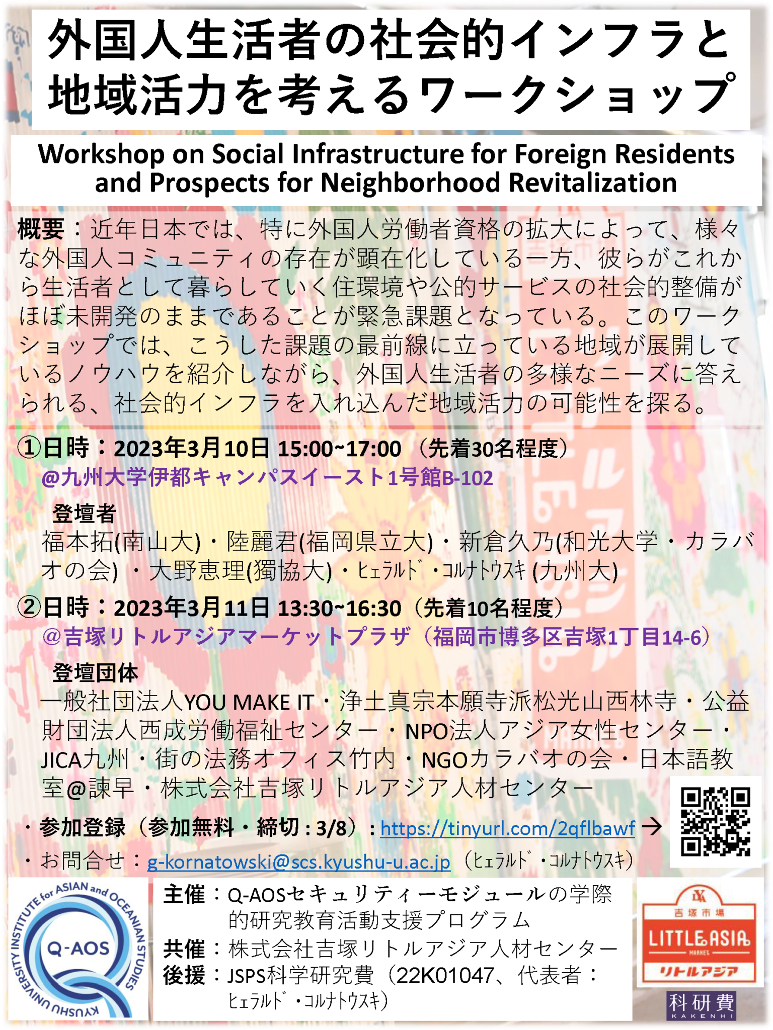 近年日本では、特に外国人労働者資格の拡大によって、様々な外国人コミュニティの存在が顕在化している一方、彼らがこれから生活者として暮らしていく住環境や公的サービスの社会的整備がほぼ未開発のままであることが緊急課題となっている。このワークショップでは、こうした課題の最前線に立っている地域が展開しているノウハウを紹介しながら、外国人生活者の多様なニーズに答えられる、社会的インフラを入れ込んだ地域活力の可能性を探る。